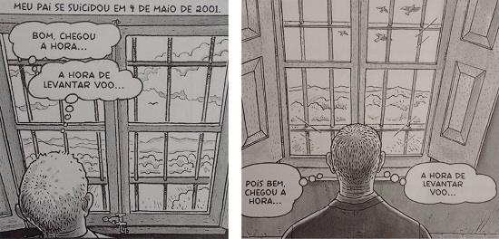 É bastante significativo o fato de a história começar e terminar na mesma ação, até mesmo no mesmo quadro: tanto o primeiro como o último enquadramento reproduzem um ponto de vista do alto e da parte de trás da cabeça de Antonio: não vemos seu rosto, não sabemos qual sua expressão momentos antes da morte. Ele diz as mesmas palavras diante da janela ainda fechada: “Chegou a hora de levantar voo” (p. 7 e 201).