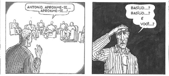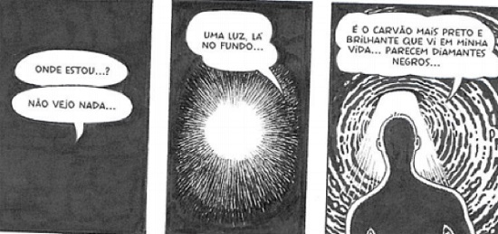 Na página seguinte (p. 119), dividida em doze quadros, o primeiro deles também é negro, mas desta vez com falas de desorientação: “Onde estou...? Não vejo nada...”, acompanhado de um terceiro quadro negro, mas que começa a se iluminar ao centro. A luz se amplia e uma figura aparece de costas e em plano médio no campo do próximo quadro, dizendo: “É o carvão mais preto e brilhante que vi em minha vida... Parecem diamantes negros...”. O negro da morte, do carvão, se materializa em uma espécie de túnel.