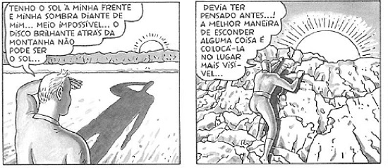 Mas logo Antonio percebe que aquilo que ele vê não é o sol, porque a sombra dele se projeta na direção errada. A bolacha dourada, o suposto sol, despenca de seu suporte junto à montanha e cai em cima de Antonio; ela tem um gosto amargo, e o rosto de outro sócio, Fernando, estampado nela – afinal é descoberto que Fernando desviava dinheiro e desaparecera sem deixar rastros, levando a fábrica à falência (p. 161).