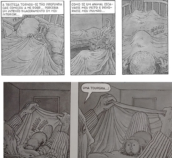 Na outra página, ela completa: “Agora vai ter que me lavar e não resistirei... Vou morrer com certeza...”. Antonio fica consternado: “Não, mãe, não vai morrer, não...”, e ele acorda, suando frio e de olhos arregalados. Somente aí temos uma evidência concreta do sonho: temos, junto ao protagonista, o mesmo estranhamento inicial com as imagens, surpreendemo-nos como ele no despertar súbito. O leitor não é deixado para trás, ele caminha lado a lado com o protagonista – proximidade essa que pode ter o efeito de envolvê-lo ainda mais no processo de leitura.