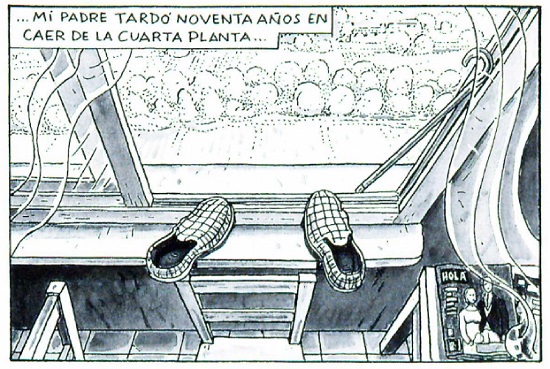 La figura uno es una de las primeras viñetas de El arte de volar. Como podemos ver en el cuadro de texto Altarriba comienza su novela con un narrador en primera persona, identificado como el hijo del protagonista. Esta voz narrativa se confundirá con la voz del personaje que representa a su padre, quien tomará el relevo en la narración sin ningún aviso o señal que diferencie donde termina uno y empieza el otro. Mediante este recurso está poniendo a ambos personajes en el mismo plano, él y su padre, como protagonistas de una misma historia, de una misma memoria traumática que tienen que descifrar y comprender juntos. Describe el suicidio de su padre como una acción que duro 90 años, la edad que tenía en el momento en el que decidió poner fin a una existencia marcada por la guerra, el exilio y la vuelta a una vida bajo una dictadura en la que vivía perseguido y amenazado.