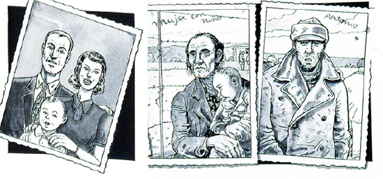 La doble vertiente visual y textual del cómic permite cuestionar la historia desde un formato en el que la narrativa se ve complementada por elementos estéticos y artísticos y en el que pueden confluir recursos muy variados como fotografía, manuscritos, cartas, artículos de periódico, panfletos, cartelería. La narrativa gráfica crea un espacio visual donde pueden confluir todos estos elementos, a los que se puede hacer referencia directa a través de la imagen. Tanto El arte de volar como Un médico novato hacen uso en multitud de ocasiones de estos recursos que forman parte de la construcción tanto del discurso histórico como de la memoria familiar y la postmemoria. En la figura tres podemos ver cómo la narración recurre a fotografías familiares y las introduce dentro de la narración al redibujarlas en el mismo estilo que el resto del cómic. A través de estas imágenes se empiezan a construir esos recuerdos, esa idea de pertenencia al ámbito familiar, y lo hace a través de las fotografías que son un instrumento atemporal, compartido por las distintas generaciones.