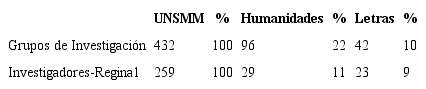El año 2017 se formaron 432 Grupos de Investigación (GI), de los cuales 42 son de Letras; 259 investigadores acreditados de los cuales, 23 corresponde a Letras y 29 a Humanidades.