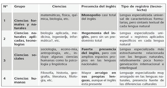 Na direção ascendente, temos uma gradação segundo a qual nas Ciências Humanas haveria uma linguagem especializada muito enraizada nas “línguas naturais”, com presença forte de diferenças culturais – aspecto que se mantém, de alguma forma, no campo das sociais. Já no campo das tecnológicas (nas quais operam determinadas formas de precisão e de estabilização lógica de sentidos) e no das naturais, vai-se na direção de uma língua especializada “universal”, porém com sintaxes ancoradas nas “línguas naturais” e – seria possível acrescentar – nas práticas de escrita fortemente codificadas nas comunidades acadêmicas, vinculadas concretamente às formas materiais e a funcionamentos específicos de cada uma das diversas línguas.