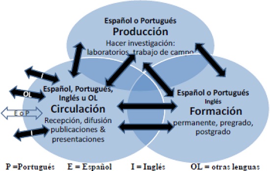 Antes de passar à proposta presente nesse esquema, considero importante frisar a necessidade de se atentar para algo fundamental: que o subcampo da circulação não seja focalizado de modo isolado ou exclusivo, recortando o “produto final”, sem que esse seja considerado como parte de um processo. De fato, parafraseando Hamel (2013, p.350), não se entende por produção científica, tal como poderíamos esperar, o processo complexo, quase sempre coletivo e interativo, de desenvolver uma pesquisa, mas somente seu resultado final: a publicação objetivada na escrita e divulgada em órgãos legitimados pelo próprio campo. Quando se trata de tomar decisões de políticas científico-linguísticas é conveniente – de acordo com o que assinala o próprio autor (ibid.) – integrar esses três subcampos (produção, circulação e formação) para não desconsiderar o processo total, o que implica um reconhecimento saudável das relações entre as dimensões de ensino e de pesquisa no universo do fazer universitário. Um argumento que ajuda a pensar nessa colocação é a crescente crítica que se faz aos sistemas de avaliação bibliométrica, que carecem de uma fundamentação qualitativa em seus princípios de seleção e de classificação: cabe pensar, por exemplo, no impact factor.