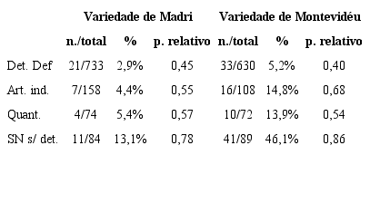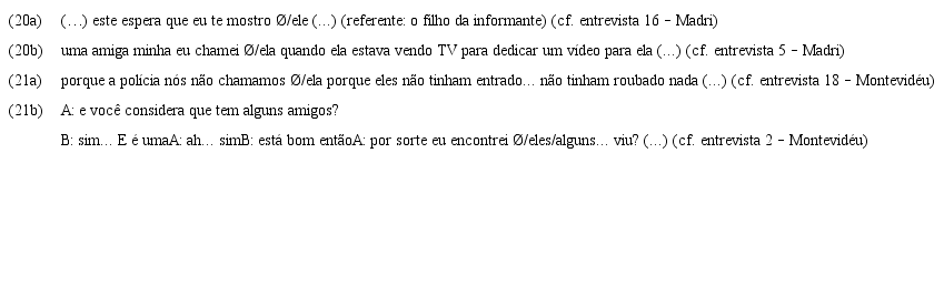 Com respeito aos SNs quantificados, verificamos que, na variedade de Madri, houve uma frequência de 5,4% e peso relativo de 0,57, enquanto na variedade de Montevidéu a frequência foi de 13,8% e o peso relativo de 0,54. Conforme Campos (1986), no espanhol, não seria possível que um SN quantificado fosse retomado por uma categoria vazia, mas apenas por um pronome indefinido. Contudo, o dado em (15b), extraído das entrevistas da variedade de Montevidéu, contraria a descrição desse autor.