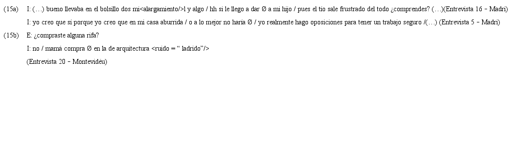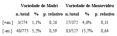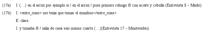 Na variedade de Madri a frequência de objetos nulos com antecedentes [-animados] foi de 5,2% e o peso relativo de 0,59, ao passo que na de Montevidéu esses valores correspondem a 15,7% e 0,64, respectivamente. Observem-se os dados em (17):