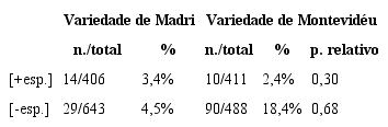 Quanto aos SNs indefinidos, observamos uma frequência de 4,4% e peso relativo de 0,55 na variedade de Madri e uma frequência de 14,8% e peso relativo de 0,68 na variedade de Montevidéu. Observem-se os dados em (16):