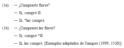 Conforme Campos (1986) e Fernández Soriano (1999), no espanhol, seria necessário que um sintagma nominal (doravante SN) [+específico] em função acusativa fosse retomado pelo pronome clítico. Por outro lado, quando se trata de um SN [-específico; -definido], seria possível a ocorrência do objeto nulo. Segundo Groppi (1997), a variedade de espanhol de Montevidéu apresentaria essa mesma tendência. Observem-se as construções em (1):