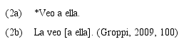De acordo com Groppi (2009), no espanhol, apenas o pronome clítico poderia retomar um antecedente em função acusativa. Portanto, a retomada desse tipo de antecedente pelo pronome tônico seria agramatical, como se observa em (2a). Nessa língua, para que o pronome tônico ocorra em função acusativa, seria preciso que fosse correferente com um clítico, que existisse a necessidade discursiva de estabelecer contraste entre dois ou mais referentes, que o antecedente fosse uma entidade [+humana] e esse pronome deveria estar introduzido pela preposição a, como se observa em (2b).