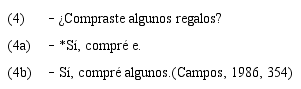 No que se refere aos SNs quantificados, conforme Campos (1986), sua expressão anafórica não poderia ocorrer mediante um objeto nulo, de modo que seria necessária a presença de um quantificador, como se observa em (4).