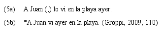 Quanto às construções em que o antecedente ocupa a posição de tópico, de acordo com Groppi (2009), seria necessária a presença de um clítico correferente no interior da oração, clítico este que, em sua análise, corresponderia ao argumento do verbo. Na oração em (5b), o antecedente constitui uma entidade [+específica] e [+humana] e a ausência do clítico tornaria a construção agramatical.