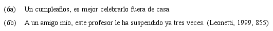 No caso de haver um SN indefinido em posição de tópico, segundo Leonetti (1999), seria possível sua retomada mediante um clítico se sua interpretação for genérica ou [+específica], como em (6a) e (6b), respectivamente.