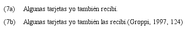 Com respeito aos SNs quantificados em posição de tópico, de acordo com Groppi (1997), nesses casos, poderia ou não haver um clítico correferente no interior da oração e sua presença seria decorrente de uma leitura referencial, na qual o SN quantificado receberia uma interpretação partitiva, como se observa em (7b).