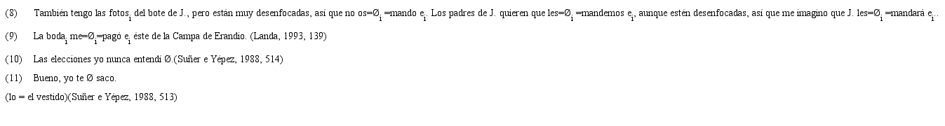 Quanto às variedades de espanhol do País Basco e de Quito, a partir dos trabalhos de Landa (1993) e de Suñer e Yépez (1988), podemos observar que essas variedades têm em comum a possibilidade de ocorrência de objetos nulos com antecedentes [+determinados] em construções que apresentam um clítico dativo e tópico.
