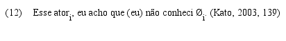 Embora Cyrino (1994) não tenha encontrado ocorrências de elipse do objeto com antecedente [+animado; +específico] no PB contemporâneo, segundo Kato (2003), essa categoria vazia poderia ter como antecedente uma entidade [+humana] se este ocupa a periferia esquerda da sentença, como em (12).