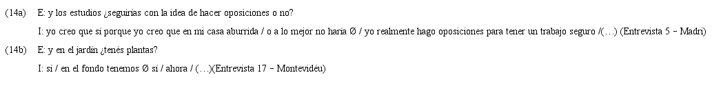 Apenas na variedade de espanhol de Montevidéu o traço semântico de especificidade foi selecionado como relevante. A frequência de omissão do objeto nessa variedade foi de 18,4% e o peso relativo de 0,60. Esse resultado confirma a nossa hipótese para essa variedade de espanhol. Observem-se os dados em (18):