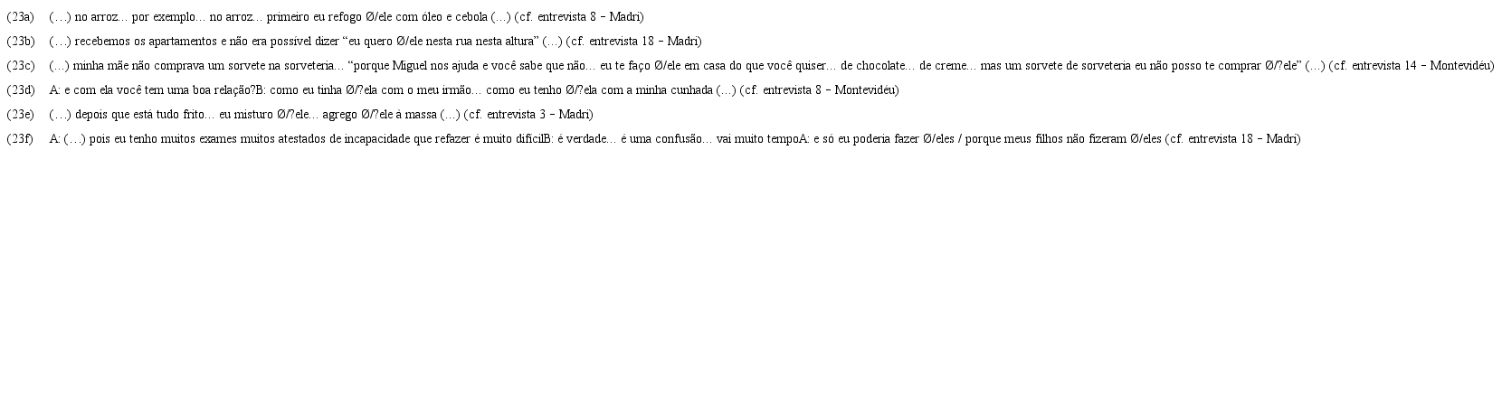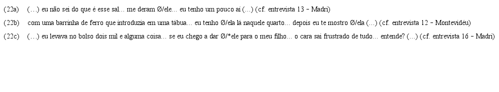 Com o objetivo de comparar as tendências encontradas nas variedades de espanhol de Madri e Montevidéu com o PB e verificar as possibilidades dessas línguas na expressão anafórica do objeto em função acusativa, selecionamos algumas das ocorrências de objetos nulos nessas variedades de espanhol e as traduzimos ao PB.
