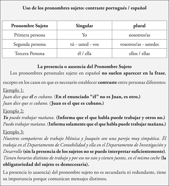 En los aspectos teóricos de la sistematización anterior, observamos que desde su título ya se marca el uso contrastivo entre el PB y el E. Por medio de ejemplos, se trabajan distintos contextos de uso en los que la presencia/ausencia de los PS se justifica por cuestiones discursivas. Estos mismos usos, como vimos anteriormente, son tratados por Fernández Soriano (1999) y Luján (1999). Así, en el 1er ejemplo, en la primera frase con el PS expreso, se quiere demostrar que se lo utiliza para marcar que la referencia de él es distinta a la del sintagma anterior Juan, o sea, es otra persona. Por otro lado, en la segunda frase del 1er ejemplo, la ausencia del PS está indicando que el sujeto nulo tiene como correferente el sintagma nominal inmediatamente anterior, en este caso Juan (Luján 1999, 1279). En el 2º ejemplo, la presencia del pronombre en la primera frase está indicando el uso contrastivo; por otro lado, en la segunda frase, como no hay necesidad de contraste el PS está ausente. En el 3er ejemplo, lo que se quiere demostrar con la primera frase es que la presencia es obligatoria cuando los sujetos son foco oracional, con acento contrastivo, por esta razón no puede recaer sobre la flexión verbal (Fernández Soriano, 1999, 1225). En la segunda frase de este mismo ejemplo, la presencia de los sujetos pronominales ya no es más obligatoria, puesto que sus correferentes están próximos en las frases anteriores. Al final de la exposición teórica, se encierra la explicación enfatizando que la presencia o ausencia de los PS en la frase es importante porque cuando estos están expresos o no en la frase “comunican mensajes distintos”. En ese sentido, Fernández Soriano (1999, 1227) afirma que “(...) no hay alternancia entre el uso y la omisión de los pronombres sujeto. (...)todo parece indicar que un pronombre no es redundante, sino totalmente imposible en algunos casos.”