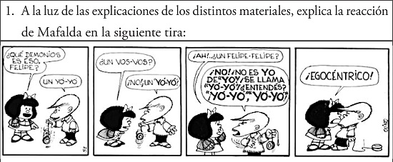En esta actividad observamos que el docente que la diseñó ya ha trabajado anteriormente los aspectos teóricos sobre el tema y les presenta a los alumnos esta tira de Mafalda, de Quino, como una muestra de los usos de los PS en E. Vemos que Mafalda está asociando el nombre del juguete yo-yo con la 1ª persona del PS con el valor que se le atribuye discursivamente a los PS cuando se lo usa con la función de individualizar o enfatizar. Felipe, el amiguito de Mafalda, intenta explicárselo varias veces hasta que al final se enoja y se lo explica de una manera muy enfática: yó -yó. Mafalda sigue entendiendo que el nombre está asociado al yo (personal) de Felipe y se enoja tanto que termina llamándolo egocéntrico. Por medio de este ejemplo, vemos una vez más que el funcionamiento del pronombre pleno en la frase se debe a factores de naturaleza más discursiva, en este caso énfasis o individualización. Por este motivo creemos, al igual que González (2008, 5), que el docente debe desarrollar “(…) un grado de reflexión pragmático-discursiva que le permita dar cuenta del espesor de la materialidad lingüística en lo que hace al sentido, de modo de comprender mejor la complejidad del proceso de aprendizaje de una lengua extranjera”.