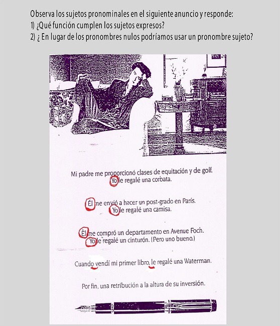 Como hemos dicho anteriormente, los docentes relataron que vuelven a trabajar con más profundidad los aspectos teóricos15, desde una perspectiva más lingüística, en los cursos superiores. Vimos también que se trata de cursos en los cuales se trabaja la sintaxis y tópicos contrastivos entre el E y el PB. Por medio de este anuncio publicitario, se les pregunta a los aprendientes qué función cumplen los PS expresos y nulos de la última frase. Las respuestas a la primera pregunta son las siguientes: en la 1ª oración, Mi padre me proporcionó … Yo le regalé una corbata, vemos que el contexto discursivo de este anuncio requiere la presencia del sujeto explícito para contrastar, en este caso, los regalos que se dan un padre y una hija en este anuncio. Recordando la teoría, conforme Luján (1999), los PS aparecen de forma explícita como una categoría enfocada para contraponerse con otra que integra el contexto discursivo. En la 2ª oración, Él me envió a hacer un post-grado en París. Yo le regalé una camisa, vemos que el sujeto de 1ª persona correferencial nuevamente es contrapuesto al de 3ª persona para contrastar, enfatizar los regalos que se dan el padre y la hija. Todos los pronombres sujeto él retoman el mismo antecedente, el SN Mi padre, o sea, son correferentes y cumplen la misma función discursiva que es la de contrastar con un yo. A la pregunta si se podría usar el pleno yo en lugar de los nulos en la 3ª oración, Cuando _ vendí mi primer libro, _ le regalé una Waterman, la respuesta es negativa, pues la intención de la hija al final del anuncio ya no es más la de seguir contrastando los regalos que ambos se daban, con su nuevo estatus de escritora, y con este último regalo, una lapicera de marca, ya estaría a la altura de todos los regalos que le hizo su padre.