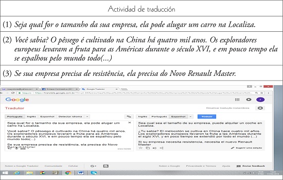 Para trabajar la comparación entre el PB y el E los docentes informaron también que diseñan actividades de traducción, sobre todo en los cursos superiores. Los alumnos las hacen como tarea domiciliar y luego en clase se hace la corrección comentada. Una actividad muy interesante que se realiza es que se comparan los resultados de la traducción también por medio de traducciones hechas en el traductor electrónico. Conforme señaló el docente: “poner traducciones hechas por medio del traductor electrónico les permite ver que esta es una herramienta que pueden usar, pero deben revisar muy bien los resultados y hacer adecuaciones”.