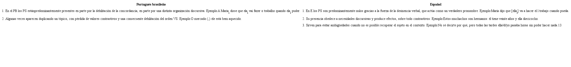 (…) es posible asumir la existencia de una diferencia fundamental entre ambas [gramáticas]: cada una de ellas presenta una distinta asimetría en lo que se refiere al empleo de formas pronominales plenas o nulas para la expresión del sujeto y de los complementos del verbo (…) mientras el PB es una lengua de sujeto pronominal predominantemente pleno y que privilegia las categorías vacías o las formas tónicas para la expresión de los complementos, el E es claramente una lengua de sujetos pronominales predominantemente nulos y de complementos clíticos abundantes, a veces duplicando (o quizás duplicados por) una forma tónica.
