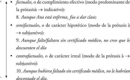 Por otra parte, si bien puede producir alguna confusión terminológica respecto de la clasificación tradicional de las concesivas como adverbiales impropias, es de destacar la pertinencia de la distinción propuesta por Flamenco (1999) entre estructuras más prototípicas o propias y menos prototípicas o impropias en virtud de su articulación,3 dada su estrecha relación con el grado de factualidad (modo en que el hablante concibe el evento de la prótasis concesiva). Así, dentro de las concesivas propias pueden distinguirse tres subclases: