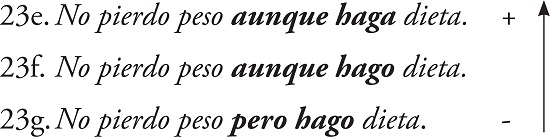 23e. No pierdo peso aunque haga dieta (la contraexpectativa adquiere un mayor relieve informativo= es inútil que haga dieta).