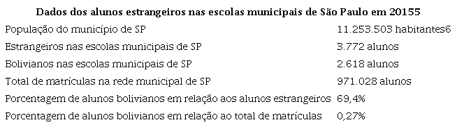 Em relação aos dados de 2015, os alunos bolivianos eram mais da metade dos alunos estrangeiros da rede pública municipal, totalizando 69,4 % do número de alunos imigrantes. Ressaltamos também que uma parte dos alunos argentinos são descendentes de bolivianos. Isso porque o fluxo migratório de bolivianos para a Argentina nas décadas de 1970 e 1980 foi alto. Segundo o censo argentino de 2010, o INDEC8 (Instituto Nacional de Estadística y Censos) contabilizou 345.272 bolivianos vivendo nesse país.