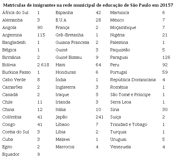 Segundo o jornal O Estado de S. Paulo de 19 de março de 2017, nos últimos cinco anos, o número de estudantes estrangeiros aumentou 71% na rede municipal (de 2.419 alunos matriculados em 2012 para 4.136 alunos em 2016) e 20% na estadual (de 4.513 em 2012 para 5.429 no ano passado). Já a formação de professores e funcionários das escolas não teve o mesmo incremento.
