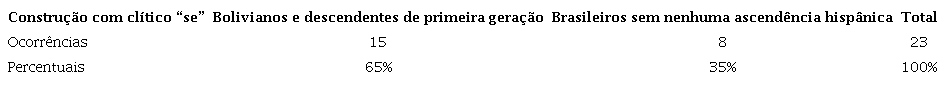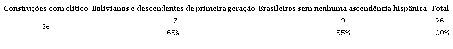 Os alunos bolivianos e descendentes de primeira geração utilizaram 12 lexemas verbais pronominalizados pelo clítico “se” na amostra e 15 formas verbais diferentes. Já os alunos brasileiros sem nenhuma ascendência hispânica utilizaram 7 lexemas verbais pronominalizados pelo clítico “se” e 8 formas verbais diferentes. Isso indica que o clítico “se” é mais usado pelos alunos bolivianos e descendentes de primeira geração. O fato de terem contato com o E – língua no qual o uso desse clítico tende a se manter – pode ser uma das explicações para esse fenômeno linguístico.