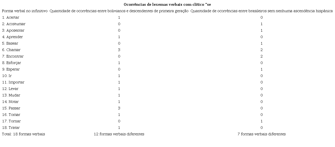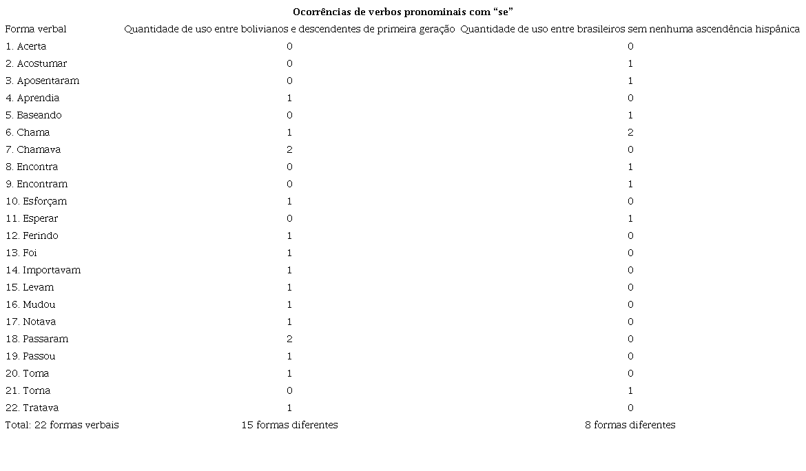 Do ponto de vista quantitativo, assim como na contabilização da tabela anterior, os alunos bolivianos e descendentes de primeira geração utilizaram uma gama maior de lexemas verbais pronominalizados pelo clítico “se”. A proporção de uso foi quase o dobro em comparação com os alunos brasileiros sem nenhuma ascendência hispânica. Isto mostra que os informantes do primeiro grupo tendem a pronominalizar os verbos com o clítico “se” nas construções pronominais em que o clítico não é objeto em comparação ao segundo grupo. Em E, grande parte das ocorrências dessas construções verbais não pode ser realizada sem a presença do clítico. Nesse sentido, aí está outra evidência de traços do E na sintaxe do PB na escrita desses alunos.