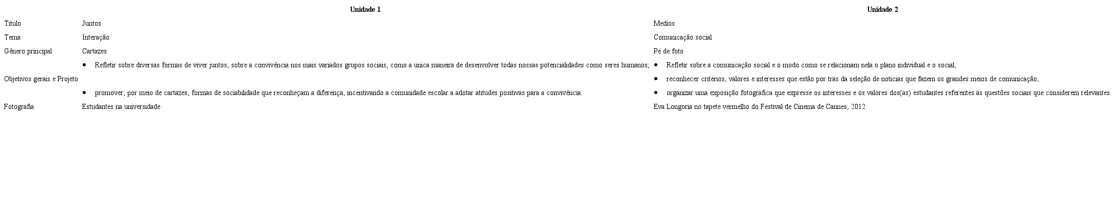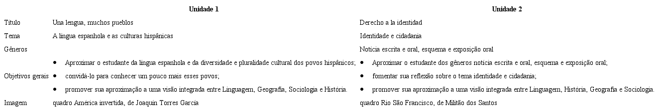 Esta coleção tem, como padrão estrutural, duas páginas de abertura que apresentam o título, o tema, os gêneros, os objetivos gerais e imagens relacionadas com o tema da unidade. O quadro 1 resume essas características das duas primeiras unidades do volume 1 da coleção.