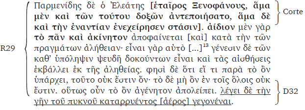 Para la sección D, LM incluyeron únicamente el final del pasaje ("dice Parménides que la Tierra nació cuando el aire denso se precipitó"), mientras que para la R conservaron el resto del pasaje segmentado. LM cortaron: "compañero de Jenófanes, al mismo tiempo que reivindicó las opiniones de éste, también echó mano de la posición contraria". En mi opinión, el texto seccionado impide desentrañar la lógica misma del pasaje. La oración ἀίδιον μὲν γὰρ τὸ πᾶν καὶ ἀκίνητον ἀποφαίνεται καὶ κατὰ τὴν τῶν πραγμάτων ἀλήθειαν ("Pues declara Parménides que el todo es eterno e inmóvil y que está de acuerdo con la verdad de las cosas") se introduce con un yàp que responde a la oración cortada del pasaje: la declaración parmenídea de que el todo es eterno e inmóvil representa un ejemplo de cómo Parménides reivindicó las opiniones de Jenófanes, a la vez que sostuvo una posición contraria. Esto se comprende muy bien a la luz del De Melisso, Xenophane, Gorgia: