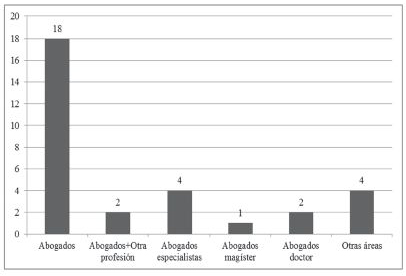 La caracterización de docentes permite establecer que el 35% son mujeres y el 65% son hombres, con edades que oscilan entre los 25 y 70 años, con una edad promedio de 42 años, cerca de diez años más que el promedio de sus estudiantes. Con respecto a su formación, por supuesto, la mayoría son abogados, 27 de los 31 encuestados y los cuatro restantes tienen formación en áreas de filosofía, antropología, psicología e historia, todos de las ciencias sociales, donde precisamente el uso de las TIC para el ejercicio de la profesión no es muy frecuente, a excepción de las ciencias jurídicas, donde los sistemas de información en entorno web son cada vez más usados.