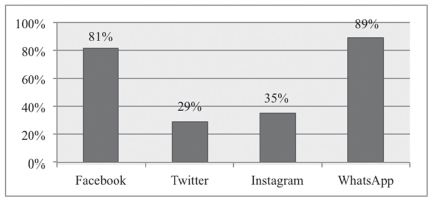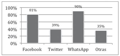El uso de Smartphone y computador personal predomina en los estudiantes, como medio para acceder a la información, a las redes sociales y a las telecomunicaciones; se destaca que el 26% de los estudiantes manifiestan disponer de los tres tipos de dispositivos. Sobre la utilización de dichos dispositivos, para propósitos generales, se consultó sobre las aplicaciones de comunicación más frecuentadas, lo cual permitió establecer que esta comunidad académica utiliza WhatsApp como principal aplicación de comunicación, seguida de Facebook; por supuesto, la primera es una aplicación de mensajería instantánea de uso generalizado y que se ha convertido en un sistema casi fundamental, mientras que Facebook permite el acceso a contenidos y a compartir información multimedia de manera ágil y con facilidad de distribución inmediata.