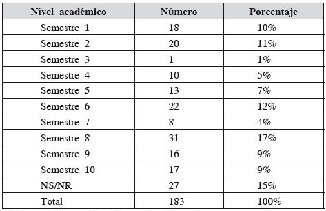 Para el caso de los estudiantes, la muestra aleatoria sobre la base de 520 estudiantes, según la fórmula estadística correspondiente, implicaba encuestar 169 para una confiabilidad del 95% y un margen de error del 3%; finalmente, se encuestaron 183 de todos los semestres o períodos académicos, desde el primer semestre hasta el décimo. En el caso de los docentes se planteó el objetivo de llegar a toda la población (N), que para el momento del trabajo de campo era de 40 docentes; respondieron la encuesta 31, 22 a través del formulario electrónico y los nueve restantes en formato físico en el aula de clase, mientras se aplicaba la encuesta a los estudiantes.