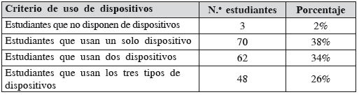 Los valores de la gráfica no corresponden al 100% dado que hay estudiantes que usan dos o incluso los tres tipos de dispositivos; de hecho, el cruce de variables permite establecer lo siguiente: