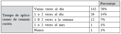 De igual forma, se consultó sobre la dedicación en tiempo para el acceso a estas aplicaciones, lo cual permitió establecer que el 78% de los estudiantes consultan sus aplicaciones de comunicación varias veces al día, lo que los convierte en usuarios asiduos de las TIC para propósitos generales.