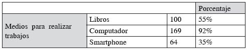 Al indagar sobre los medios más usados para la realización de trabajos independientes de aprendizaje se establece que el primordial es el computador personal con acceso a Internet; sin embargo, y como es de esperarse en un programa presencial donde la consulta de materiales impresos, códigos y libros especializados es generalizada, aún los libros de texto son utilizados por el 55% de los estudiantes; incluso cuando la mayoría están, posiblemente, disponibles en formato digital.