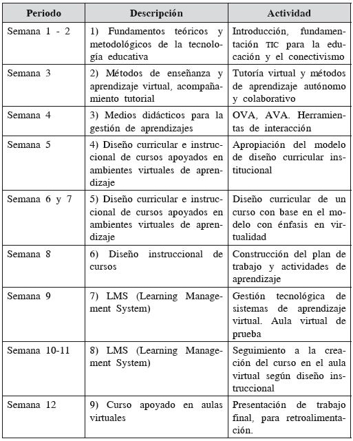 Medios. Los medios didácticos incluyen los textos institucionales disponibles en el aula virtual, tales como el modelo de educación a distancia y virtual, el modelo curricular y los documentos de apoyo seleccionados por el docente tutor y el coordinador de la Ruta de Formación Docente de la Corporación. También se usará un aula virtual con foros de discusión para cada unidad de conocimiento y actividades de aprendizaje que permitan el desarrollo de las habilidades propuestas en el área de contenidos del curso, lo cual incluye un espacio para cada participante en un aula virtual de prueba donde pueda montar un curso y aplicar lo visto en este programa de formación.