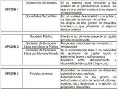Como se evidencia en la figura 1, los operadores urbanos pueden expresarse de tres formas: la primera, como organismos autónomos o sociedades mercantiles; la segunda, como sociedades públicas, sociedades de economía mixta con mayoría pública o sociedades de economía mixta con mayoría privada; y la tercera, como modelos externos adyacentes a las particularidades normativas de la administración pública.