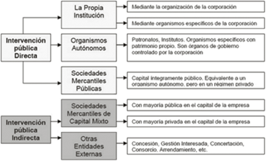 En la segunda figura vemos cómo se puede estructurar un operador urbano según su forma de intervención en el territorio destinado a la renovación: si se trata de una intervención pública directa, incluye sociedades mercantiles públicas, organismos autónomos y la actuación del mismo operador urbano; si es una intervención pública indirecta, acoge a sociedades mercantiles de capital mixto y otras entidades externas como asociaciones público-privadas, concesiones, consorcios, entre otros.