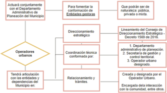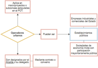 En la primera imagen podemos ver la aplicabilidad de los operadores urbanos en macroproyectos y subzonas del POT; a su vez, esta designación es voluntad del alcalde del municipio mediante contrato o convenio, y estos pueden constituirse como empresas comerciales e industriales del Estado, establecimientos públicos y sociedades de economía mixta con participación mayoritariamente pública.