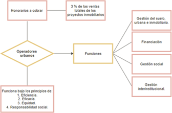 Lo primero que quiero resaltar son los principios bajo los cuales debe obrar: eficiencia, eficacia, equidad y responsabilidad social. Dentro de sus funciones, nos encontramos con la gestión del suelo urbano e inmobiliario que se refiere al proceso de dirección en el suelo que será intervenido; la financiación que corresponde al recaudo, administración, ejecución y direccionamiento de recursos tanto públicos como privados; la gestión social que no es una función privativa, sino que se debe articular con la administración municipal para implementar una política de protección a moradores, encontrando una conexión directa con el relacionamiento y los trámites de la entidad creada y designada por el mismo operador urbano. Y, finalmente, la gestión interinstitucional que se refiere a la facultad de integrar a los diversos actores económicos y sociales que intervendrán en el área de renovación (Decreto 893, 2017). Los honorarios por cobrar serán por el 3 % de las ventas inmobiliarias del proyecto de renovación.