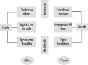 A parte de las actividades económicas no formales, también se pueden encontrar otros hechos como “la aparición de ciertas patologías sociales, como violencia callejera, venta de drogas y prostitución, entre otras actividades ilícitas” (Pizano, 2012, p.14). Y todo este acumulado social producto de las políticas estatales neoliberales, se convierte en la fuente que justifica la renovación urbana; es decir, el Estado, a través del mercado, crea las condiciones que provocan problemas de toda índole, con mayor impacto urbano; después, el mismo Estado, en conjunción con el sector privado, ofrece una solución que no acoge a las personas que padecen estos problemas, sino que fragmenta y excluye, debido a que la posibilidad de consumo y acceso a ese nuevo espacio revitalizado no es la misma para todos los habitantes de la ciudad. “De la misma forma en que aparece el Estado con políticas segregacionistas de los pobres, también aparece el mercado que segrega en función de la capacidad adquisitiva del consumidor” (Brites, 2017, p. 578).