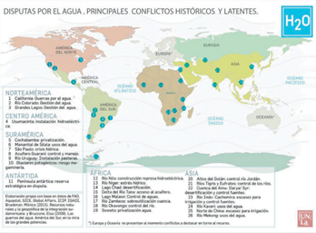 Como se puede ver, este recurso es un potencial causal de conflicto, por lo que es importante señalar que varios autores y organizaciones han identificado diversos conflictos alrededor del agua dulce en el mundo, tal y como se muestra en la figura 10.2, en la que se detallan las disputas entre Estados Unidos, Rusia, Canadá, el norte de Europa y China por la soberanía del Polo Norte, los conflictos alrededor de grandes ríos como el Nilo, el Colorado y el Amazonas, por ser parte de las fronteras naturales o por pasar a través de varios países en un mismo continente, entre muchos otros conflictos (“El agua como recurso geoestratégico”, 2021).