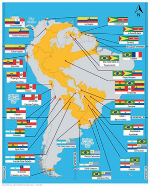 Específicamente en América Latina, además del potencial conflicto alrededor del río Amazonas se detectan problemas en la soberanía del Polo Sur, y en el hielo de las montañas que hay entre Chile y Argentina, pero también en los acuíferos de esta región, como se muestra en la figura 10.3, en la que podemos observar que la mayoría de dichos acuíferos se encuentran compartidas por varios países, por lo que se denota como potencial conflicto para saber cuál de ellos administraría estas fuentes (Espasande y Dufour, 2021). Gracias a estos análisis se vuelven realmente alarmantes las afirmaciones como las del exvicepresidente del Banco Mundial en 1995, Ismail Serageldin, quien dijo: “las guerras del próximo siglo serán por el agua”, y luego, en el 2017, fue el papa Francisco quien exclamó: “Me pregunto si caminamos hacia la Gran Guerra Mundial del Agua” (Espasande y Dufour, 2021).