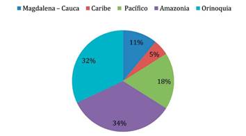 Así las cosas, teniendo en cuenta que el principal suministro de agua en Colombia para los estanques, lagos y aguas subterráneas, además de la lluvia, es el proceso de escorrentía superficial, que se da la mayor parte del tiempo por la unión de corrientes o la disolución de glaciares que luego se juntan formando arroyos, quebradas y ríos, se mostrará un pequeño análisis por regiones de la variabilidad espacial de la escorrentía en el país, realizado por el Ministerio de Ambiente, Vivienda y Desarrollo Territorial (2010); se tiene que, cerca de la capital del país hay baja oferta hídrica que oscila entre los 400 y 700 mm de escorrentía; luego, la región Caribe se reconoce por tener diversidad en su relieve, por lo que se encuentran diferentes valores de escorrentía según el departamento, desde 1000 mm en Santa Marta, por la Sierra Nevada, y desde 25 mm en La Guajira. Por su parte, en la región de la Orinoquía corren los ríos Arauca y Casanare con una escorrentía medianamente alta; en la región de la Amazonía se encuentran los ríos Caquetá, Putumayo, Vaupés y Guainía que presentan una valoración de escorrentías entre 3000 y 4200 mm, siendo bastante alto el nivel; finalmente, en la región Pacífica, por sus ríos, la escorrentía varía entre los 3000 y los 5200 mm. Lo anterior se representa en porcentajes de la siguiente manera: 11 % en la Región Magdalena-Cauca, 5 % en la región del Caribe, 18 % para la región del Pacífico, 34 % en la región de la Amazonia y 32 % en la región de la Orinoquía. Esto se ilustra en la figura 10.4, diseñada por el IDEAM en el Informe Anual sobre el Estado del Medio Ambiente y los Recursos Naturales Renovables en Colombia, citado por el Ministerio de Ambiente, Vivienda y Desarrollo Territorial (2010, p. 23).